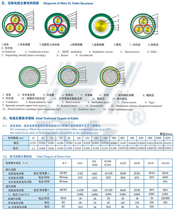 交聯(lián)聚乙烯絕緣電力電纜XLPE INSULATED POWER CABLE一、交聯(lián)聚乙爆絕緣電力電纜簡介 Brief introlluction to Xlpe lnsulated Power Cable我國自從六十年代以來,交聯(lián)染乙烤電纜得到飛速發(fā)展,已經(jīng)取代了油浸紙絕緣電力電境,交聯(lián)電黣,因其具有優(yōu)異的電氣性能、良好的熱過載特性,電壓等級高,傳輸容量大、重量輕及數(shù)設(shè)不受落差、可垂直數(shù)設(shè),電纜安裝和運行維護方便等優(yōu)點,它不僅可以在35KV及以下的中,低壓范圍內(nèi)得到廣泛應(yīng)用,而且在66.110及220KV的高壓輸電線路中也已大量采用,并且在某些先進工業(yè)國家已經(jīng)開發(fā)出了500KV壓交聯(lián)電力電纜。Since the 1960s,China has made rapid progress in its XLP'E cable,replacing the oil paper insulated power cable, Because of its outstanding electricityproperty.good overload,high voltage,.large transmission capacity.light weight and laying without drop limit,vertical laying.convenient installation andoperation maintenance and other strong points,XL. cable can not only be widely used in 35KV and below medium and low voltage scope, but also largelyused in 66,110 and 220KV high voltage transmission lines. And, in some developed industrial countries 500KV super-high voltage XL, cables have beenopened up.二、產(chǎn)品標準 Product Standard:我廠按國際GB/T12706-2008《額定電壓1KV到35KV擠包絕緣電力電境及附件),GB11017-89《額定電壓110KV銅芯,鋁芯交聯(lián)聚乙烯絕緣電力電纜)生產(chǎn)交聯(lián)雜乙烤電埋,GB/T12706-2008標準等效國際標準IEC502-2001《額定電壓1-30KV的擠包絕緣電力電境及附件),GB11017-89參照采用國際標準IEC810-1988(額定電壓:30KV-150KV擠包絕緣電力電纜實驗)。本廠還可以根據(jù)用戶要求,設(shè)計制造具有某些特殊要求的交聯(lián)電纜Our factory produces XLPE cable according to state standard GB/T12706-2008 "Rated voltage 35KV and below copper core and aluminium coreplastic insulated power cable" and GB11017-89 "Rated voltage 110KV copper core and aluminium core XLPE insulated power cable" .The GB/T12706-2008 standard is equivalent to international standard IEC502-2004 "Rated voltage 1-30KV plastic extruded and wrapped insulated power cable.TheGB11017-89 standard adopts intermational standand IEC840-1988 "Rated voltage 30-150K extruded and wrapped insulated power cable experíment" .Our fatory can also design and produce some XL. cable for special requirements according to clients' demand.三、使用性能 Property for Use:1電纜導體的高額定溫度為90℃。2短路時(長持續(xù)時間不超過5S)電纜導體的高溫度不超過250℃.1. Max,rated temperature of cable conductor is 90 ℃.2. For short eireuit (max. sustained time not exeeeding is), max.temperature of eable conductor not exceeding 250 ℃.四、交聯(lián)電纜額定電壓等級、型號、規(guī)格規(guī)定 XL cable rated voltage grade,type and specfications:電纜額定電壓的選擇:電纜額定電壓應(yīng)適于使用電纜的系統(tǒng)電壓和運行狀況,用U./U(Um)表示,單位為KV。U.——電纜設(shè)計用的導體或金屬套之間的額定電壓U——電纜設(shè)計用的導體之間的頻定工頻電壓。Um——設(shè)備高電壓(使用設(shè)備的系統(tǒng)高電壓的大值)Cable rated voltage selection: Cable rated voltage should be suitable to the system voltage and operation conditions of used cable,expressed by U'./Ai(U'm), all are effective value, unit is KV.U. -rated voltage between conductor for cable design and sereen or metal sheath.U - rated industrial frequency voltage between conductors for cable design.U'm -max. voltage of equipment (max. value of max. voltage or equipment system used).五、相系統(tǒng)用電纜的額定電壓如表1規(guī)定 For rated voltage of system cable,see Table 1.單位 Unit:KV表1Table 1U3610152035631101:303.617.524Uim7.212364272.5126 1類電纜0.68.721183.6612183664Category 1 CableU第2類電纜260.63668.7121848-Category 2 cable注:以.按系統(tǒng)接地故障持續(xù)時間不同分為兩類,具體分類如下:1類電纜——用于單相接地故障時間每一次一般不大于lmmin的系統(tǒng),也用于長不超過8h,年累計不超過125h的系統(tǒng)。第2類電境——用于接地放障時間更長的系統(tǒng),對電境絕緣性能要求較高的場合,也可采用第2類。Note: L'. is divided into two categories according to different sastained time for system' s earthing breakdowreCategory I- used in sstem with singe phase earthing breakdown genernly les than I min. each timealbo used in les than 8h,an accumul-ation of less than l25h in a year._____.__.______._______.._____..__.Categoty 2- used in system with earthing breakdown more longer, and also used in places with relatively higher demand in cable insulation.
